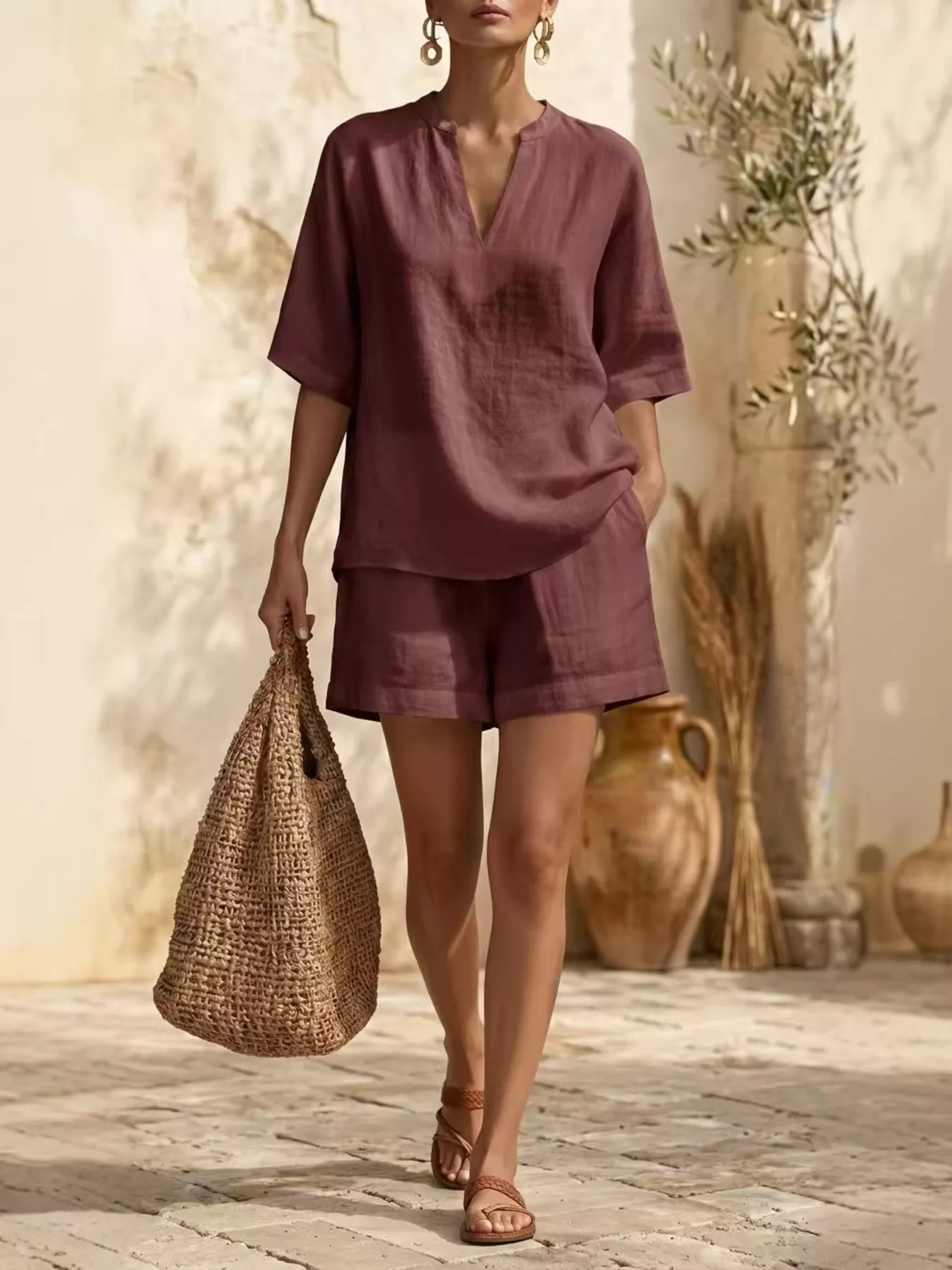 Full Size Notched Half Sleeve Top and Shorts Set Plus Size
