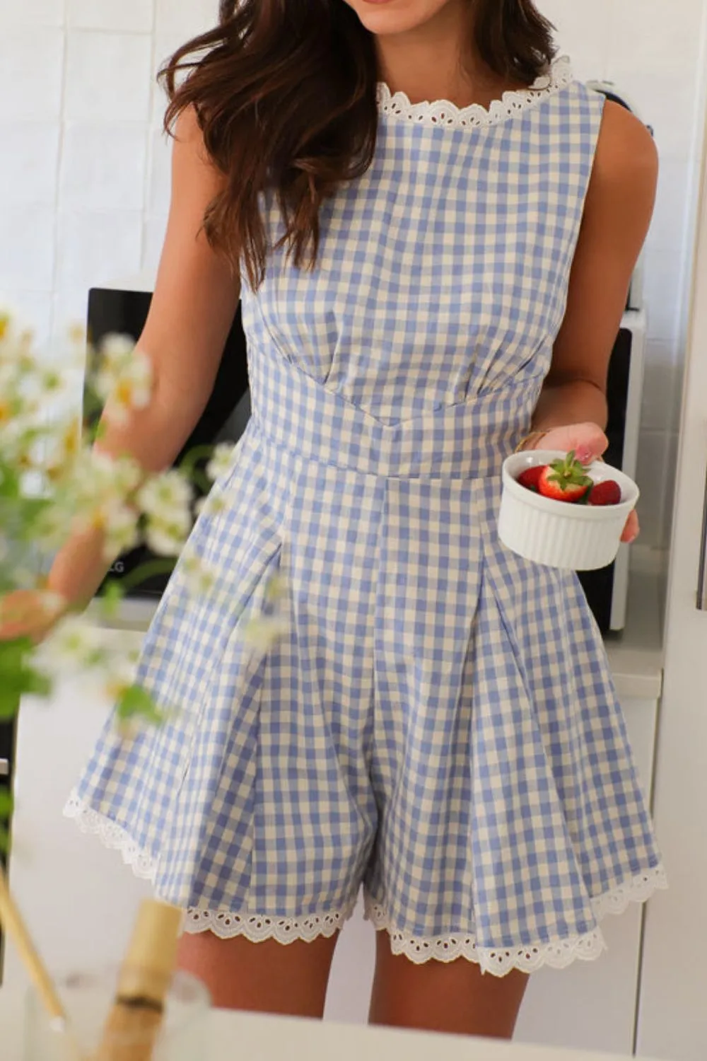 Lace Detail Plaid Sleeveless Romper